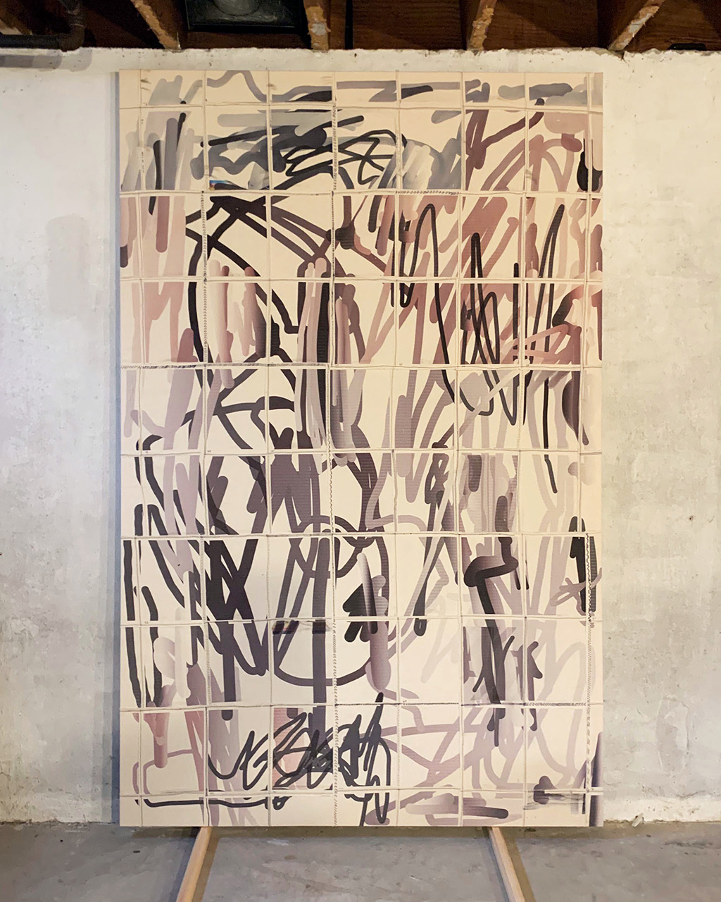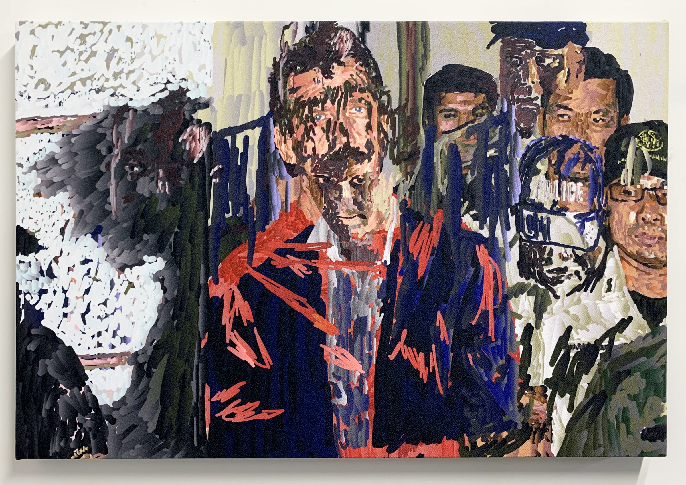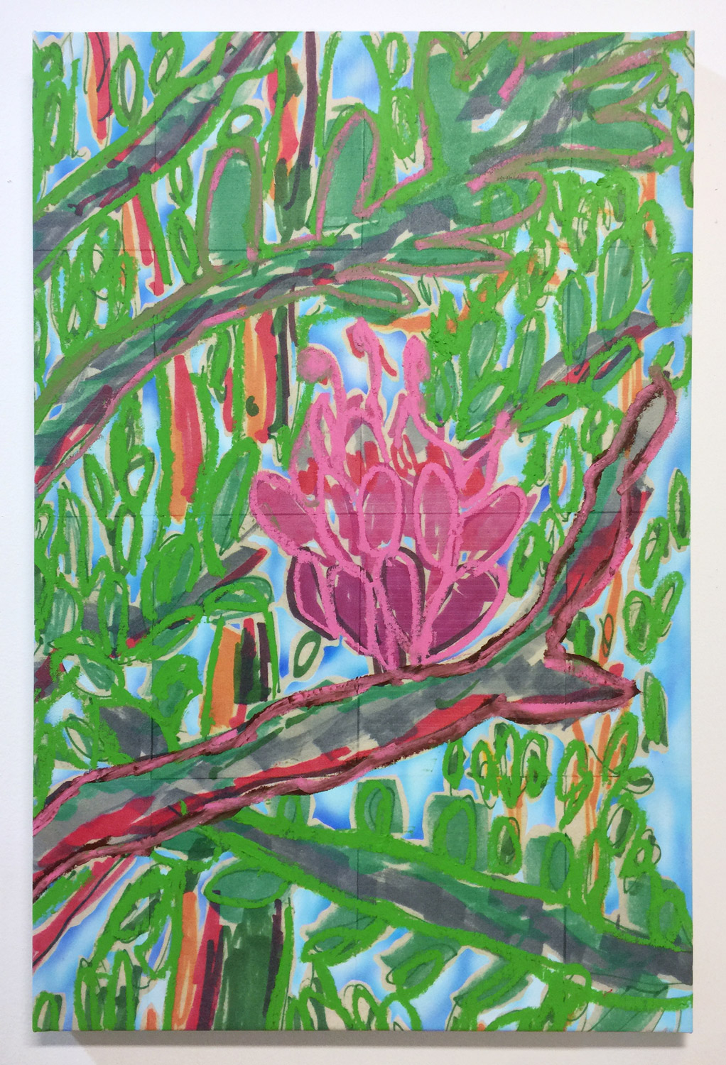 Iron-on transfer, airbrushed acrylic and oil stick on canvas