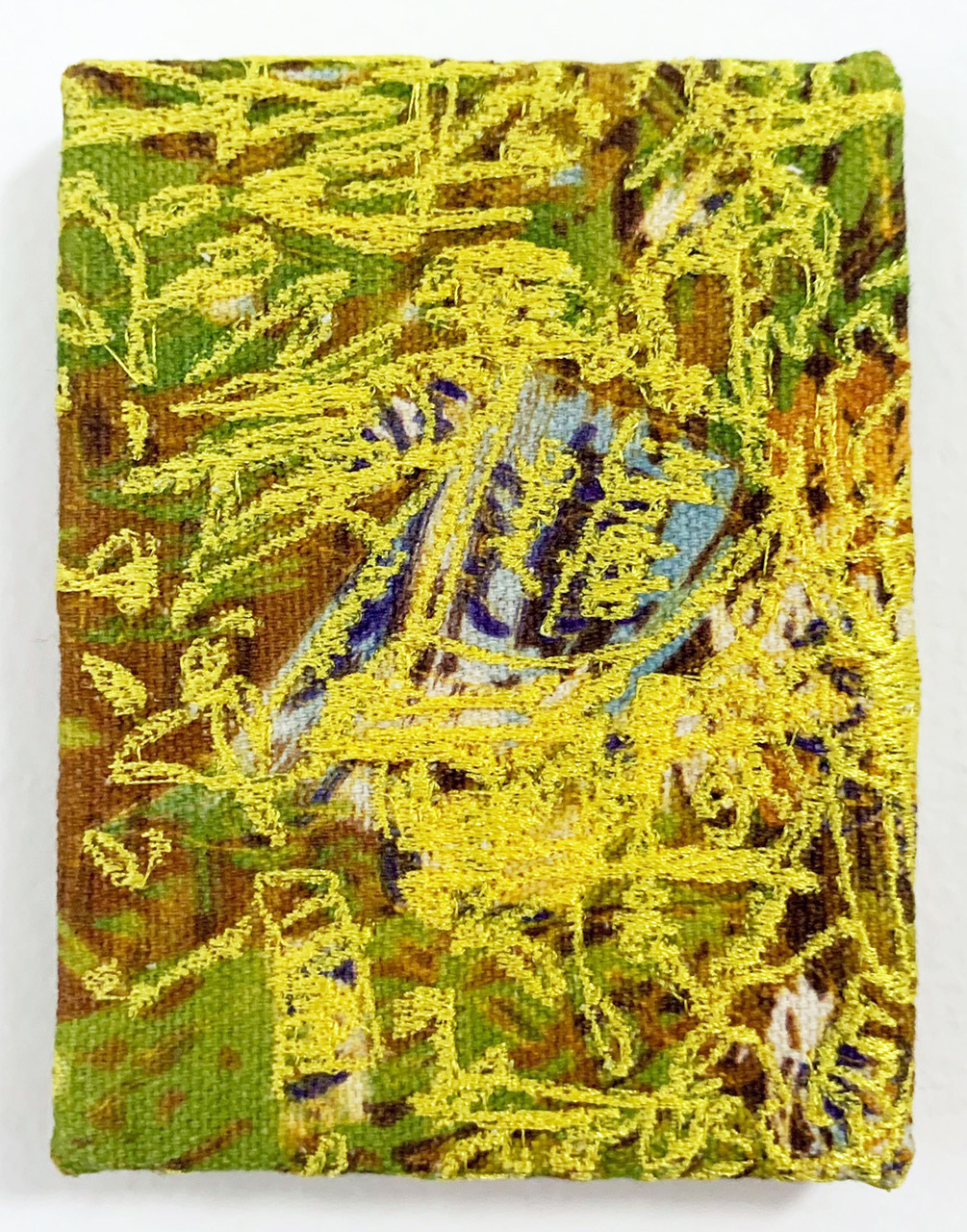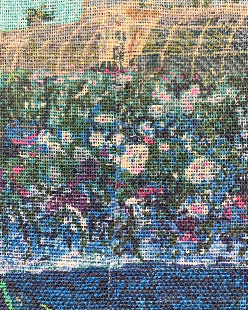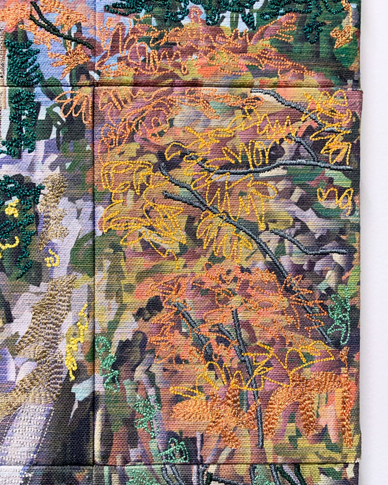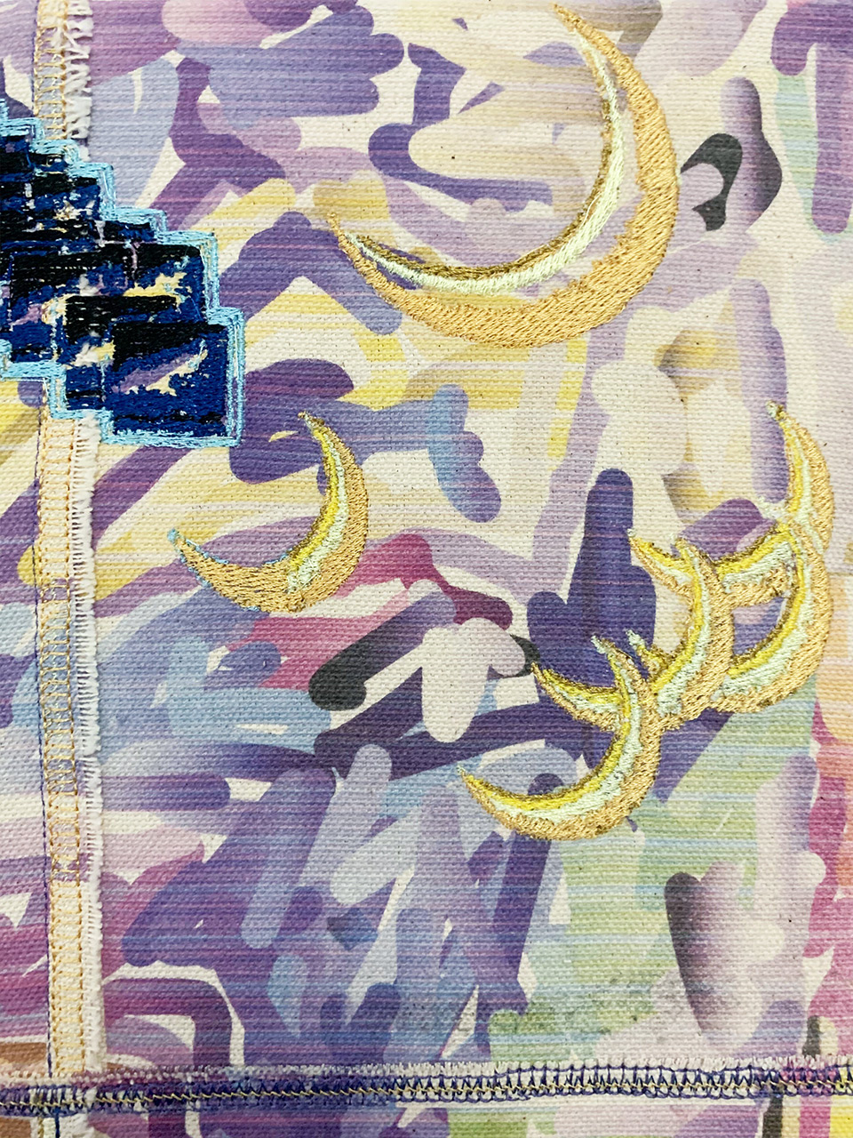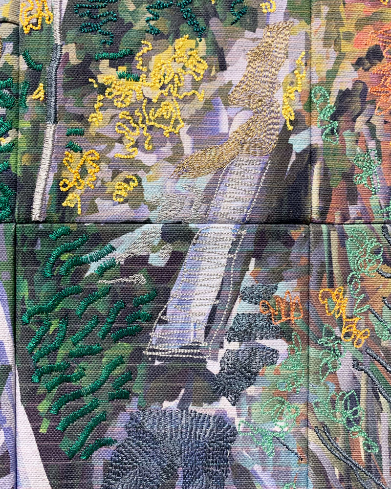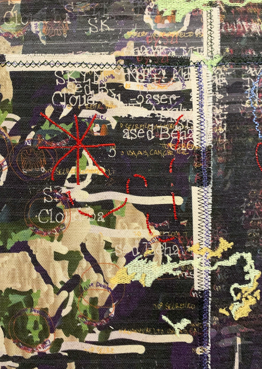 Pigment print and computerized embroidery on canvas