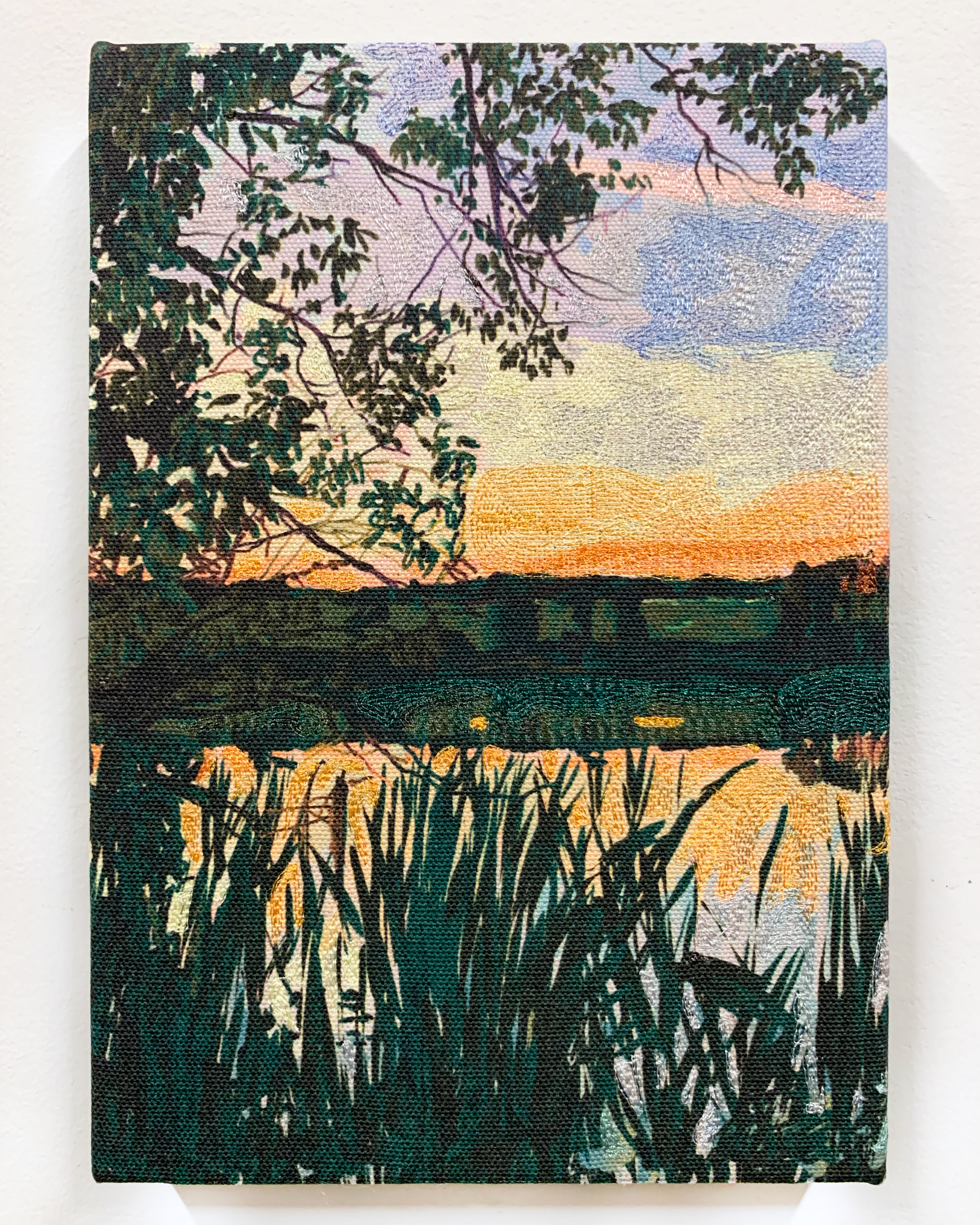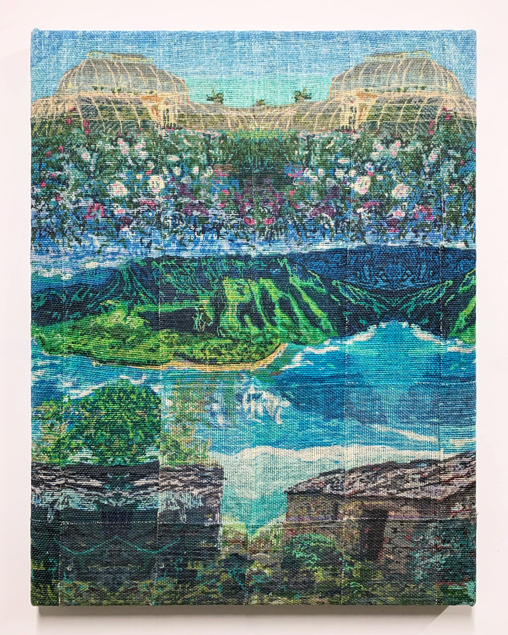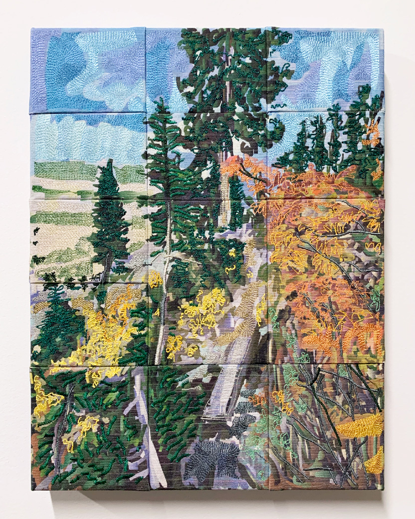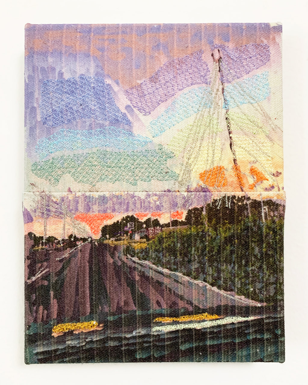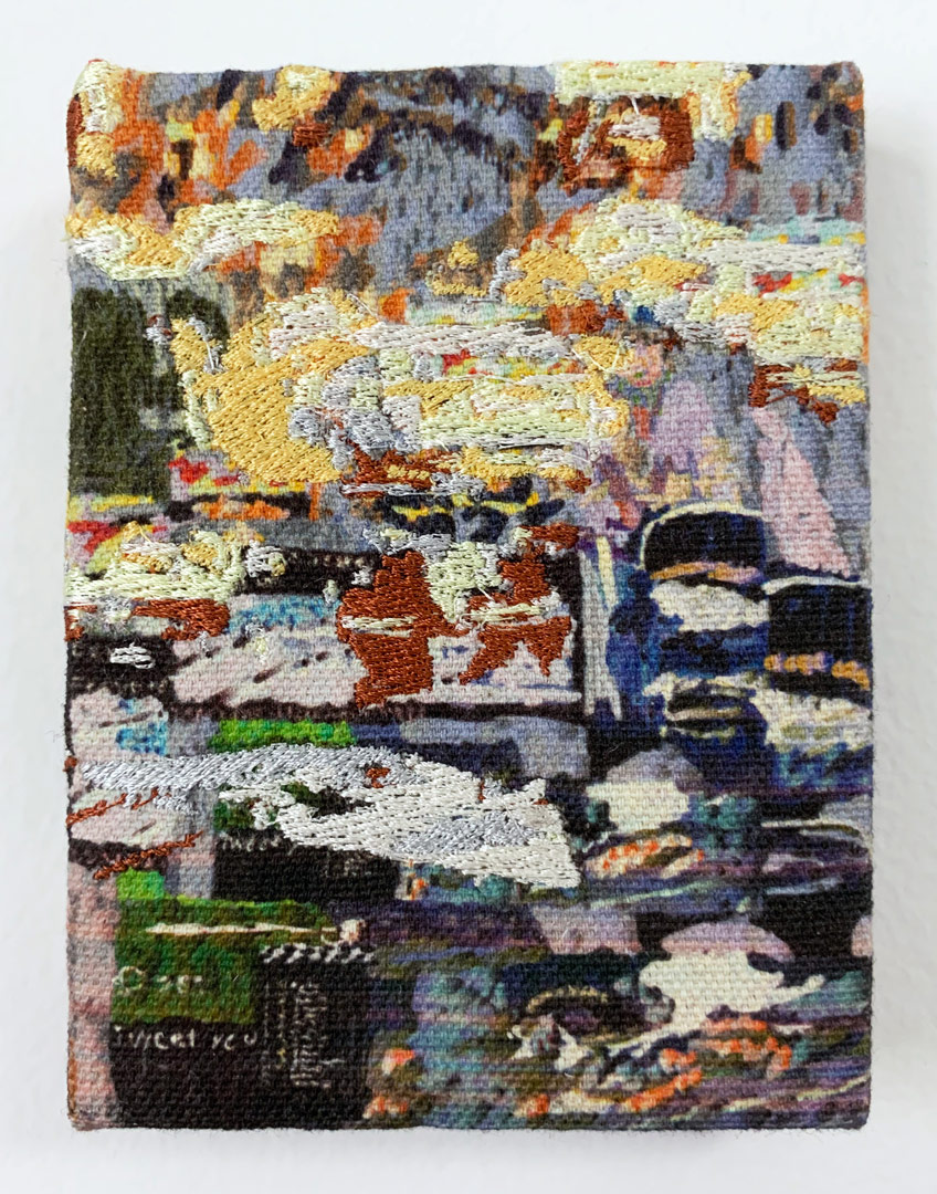Pigment print and computerized embroidery on canvas